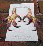 Acrylic laser-cut earrings - ~3" tall mounted on stainless steel hypoallergenic studs. (Opaque white backer).
